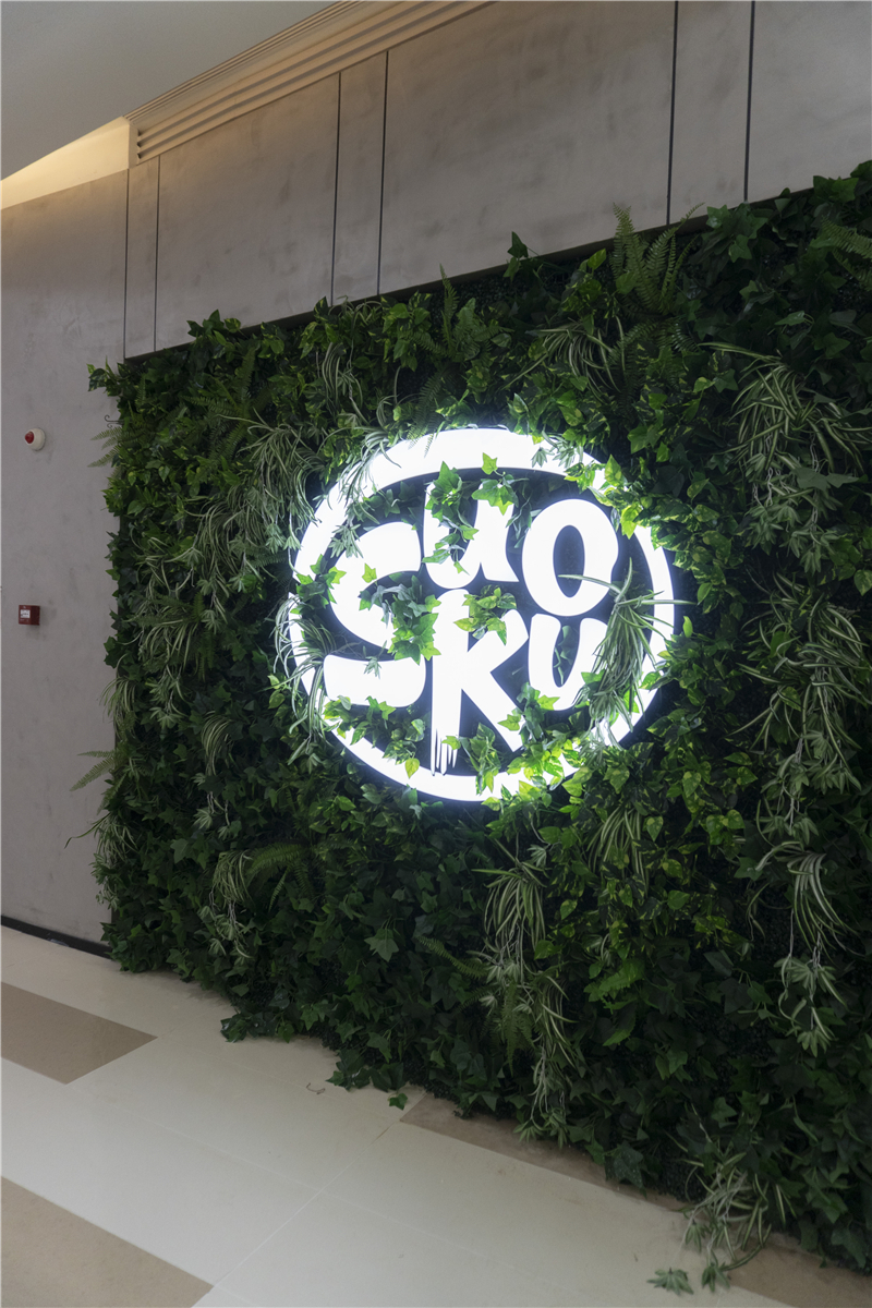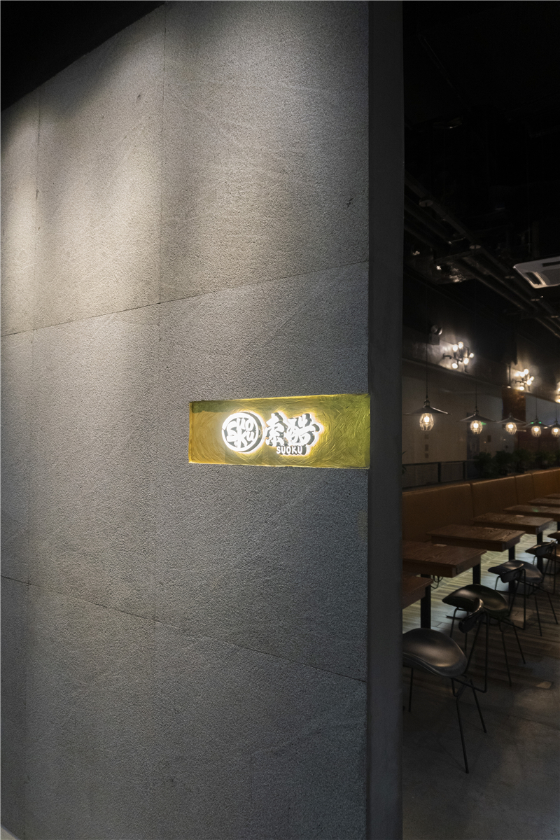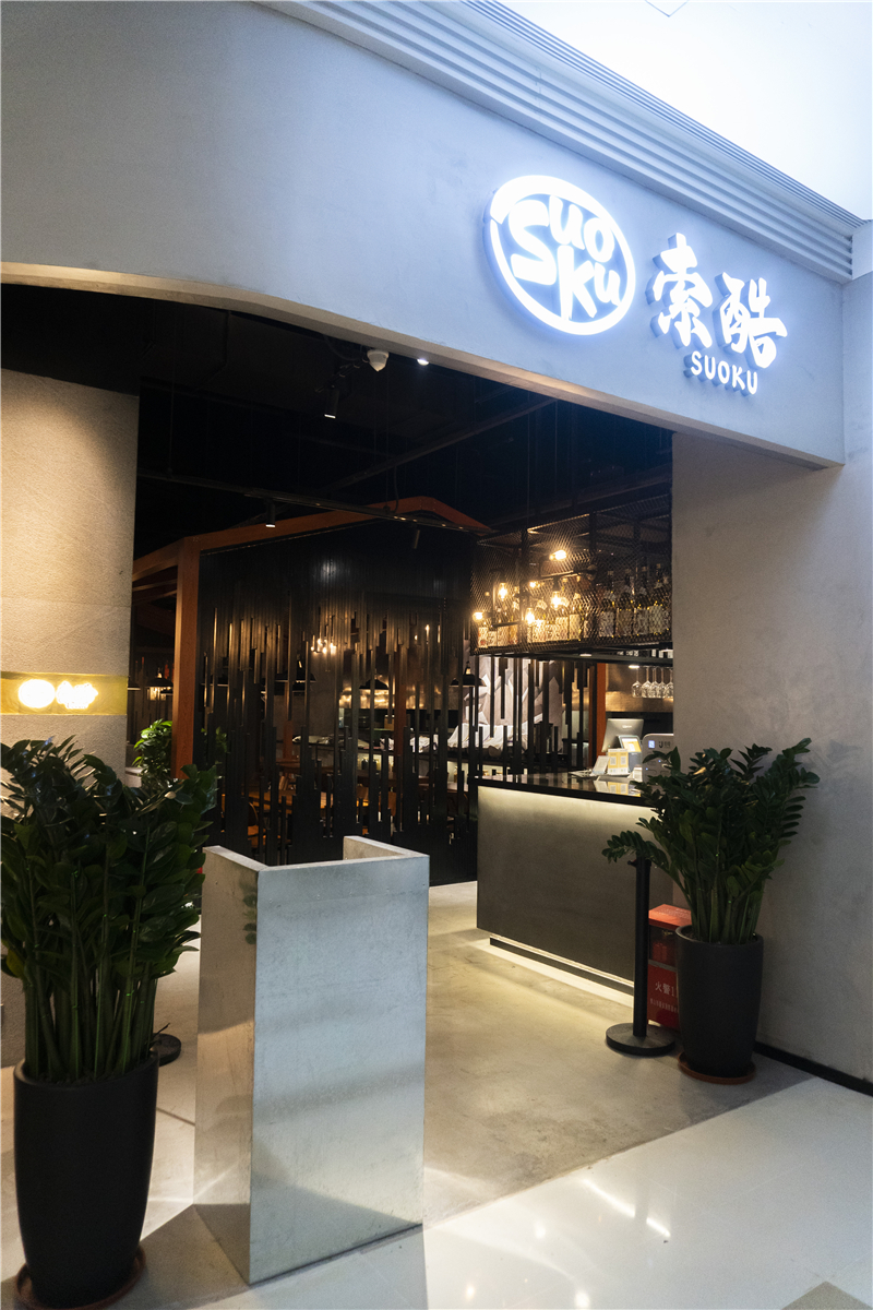 夜幕降臨,華燈初上,橢圓形SUOKU Logo在黑色原頂、鍍鋅鐵皮、麻石屏風(fēng)和金屬肌理漆映襯下,顯得格外耀眼,路人的視線都被吸引了過來。