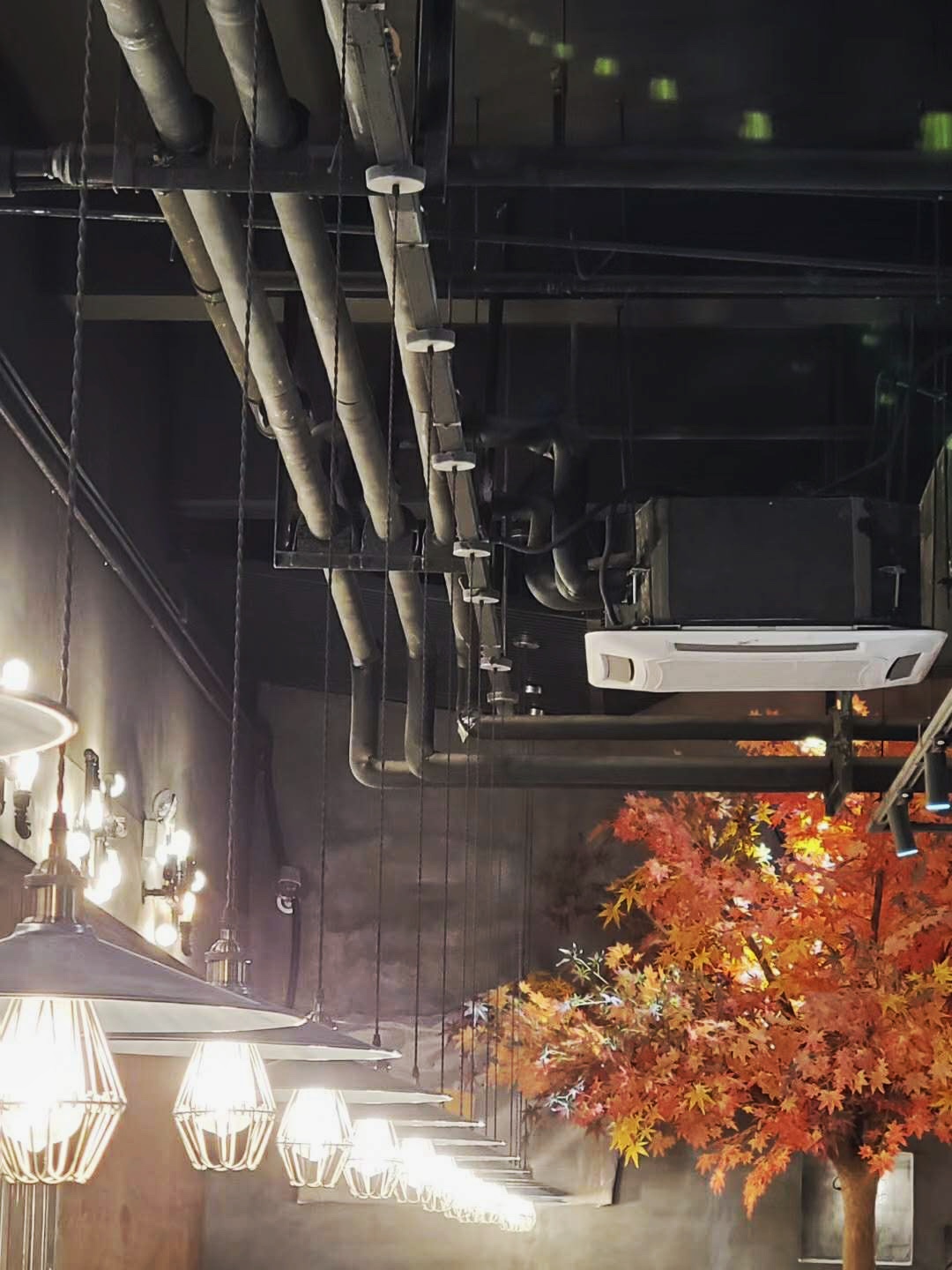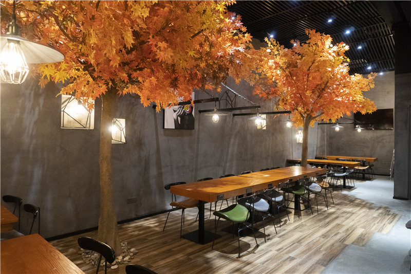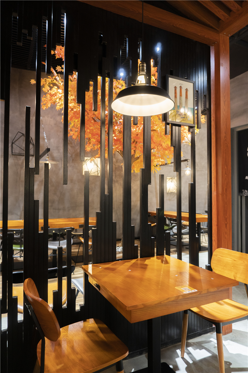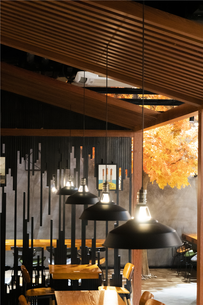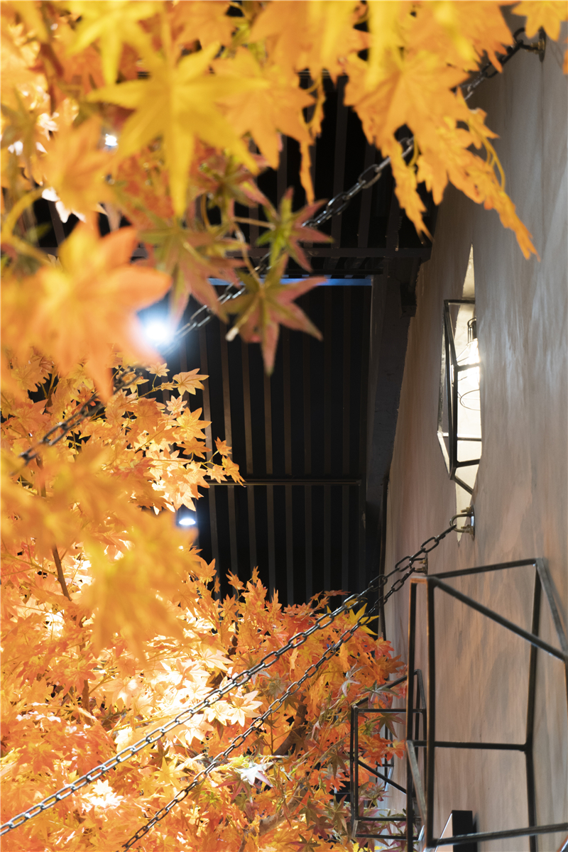 黑通、鐵索、鵝卵石、工業(yè)風(fēng)燈罩在楓葉樹下,濃情耳語,相得益彰。在此品嘗索酷混合料理 ,親情、友情、愛情在濃濃秋意中得到升華。