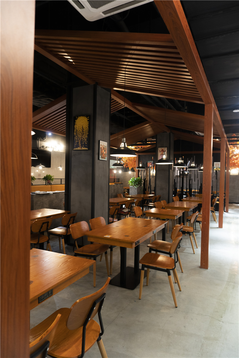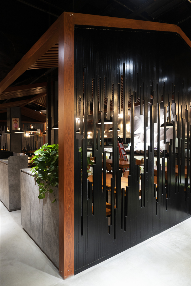 橘紅色木紋轉(zhuǎn)印鋁通構(gòu)成的框架,是整個(gè)餐廳內(nèi)最顯眼的造型。108根60*60鋁通作“頂”、8根120*120立通作“柱”,搭建起的工業(yè)時(shí)代“房中房”,將屋底劃分成若干的獨(dú)立小空間。燈光的渲染、木飾面的餐桌、器皿的匹配,此處自然成為享受料理美食,彰顯消費(fèi)個(gè)性的好去處。