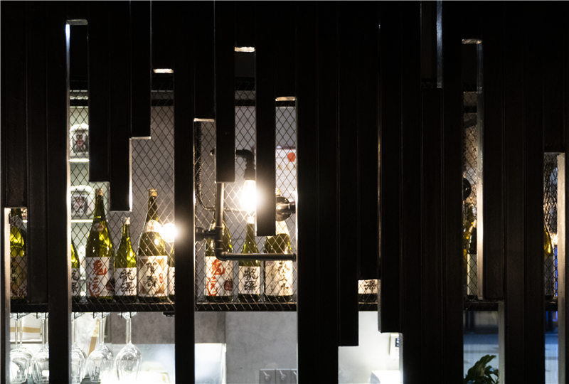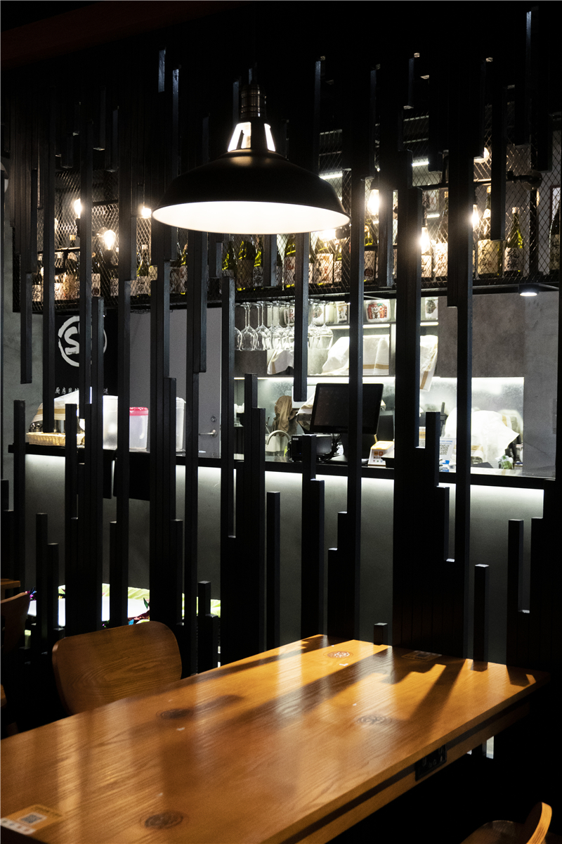 “房中房”兩端造型隔斷,純手工切割的工業(yè)風(fēng)裝置屏風(fēng),運(yùn)用了近600根鐵通焊接而成。設(shè)計(jì)語言中的打散與錯(cuò)落、疊加與留白,賦予了空間更多的層次與神秘。