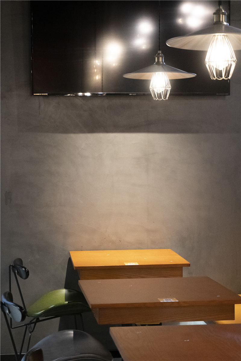 “索酷”店內(nèi)的桌椅家俬根據(jù)設(shè)計(jì)風(fēng)格定制,皮質(zhì)座椅、橡木桌面板材、彩色皮面網(wǎng)紅“螞蟻椅”,與水泥灰、鐵質(zhì)黑的搭配,既形成色彩明確的對(duì)比,又有高度的和諧,在看上去似乎冰冷的氛圍里,無不透出一絲暖意。
