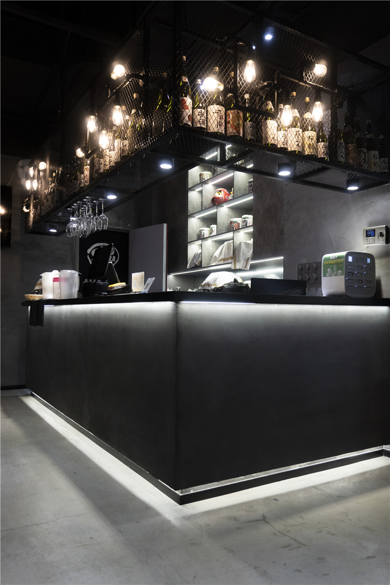 舉目環(huán)顧,設(shè)計(jì)師以黑色天花線管、灰色系的石材、沉穩(wěn)的木元素地面與原始觸感的水泥墻面等混搭,帶來一種粗獷冷酷的高級(jí)感、沉靜而從容。