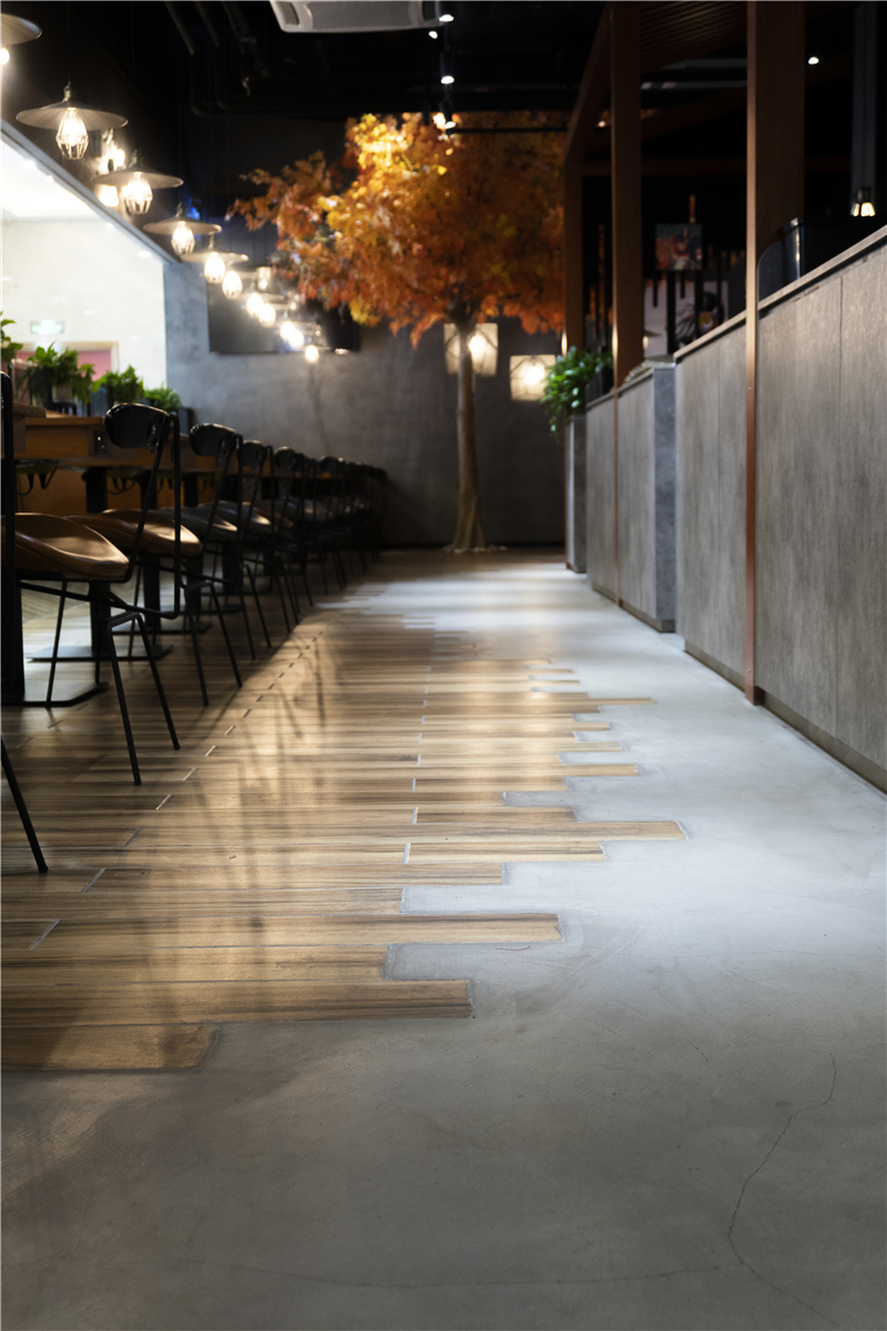 向深處步入,踏著木紋磚與復(fù)古水泥自流平交錯(cuò)曲線,如同指尖在鋼琴鍵盤上跳躍,更酷、更靈動(dòng)。