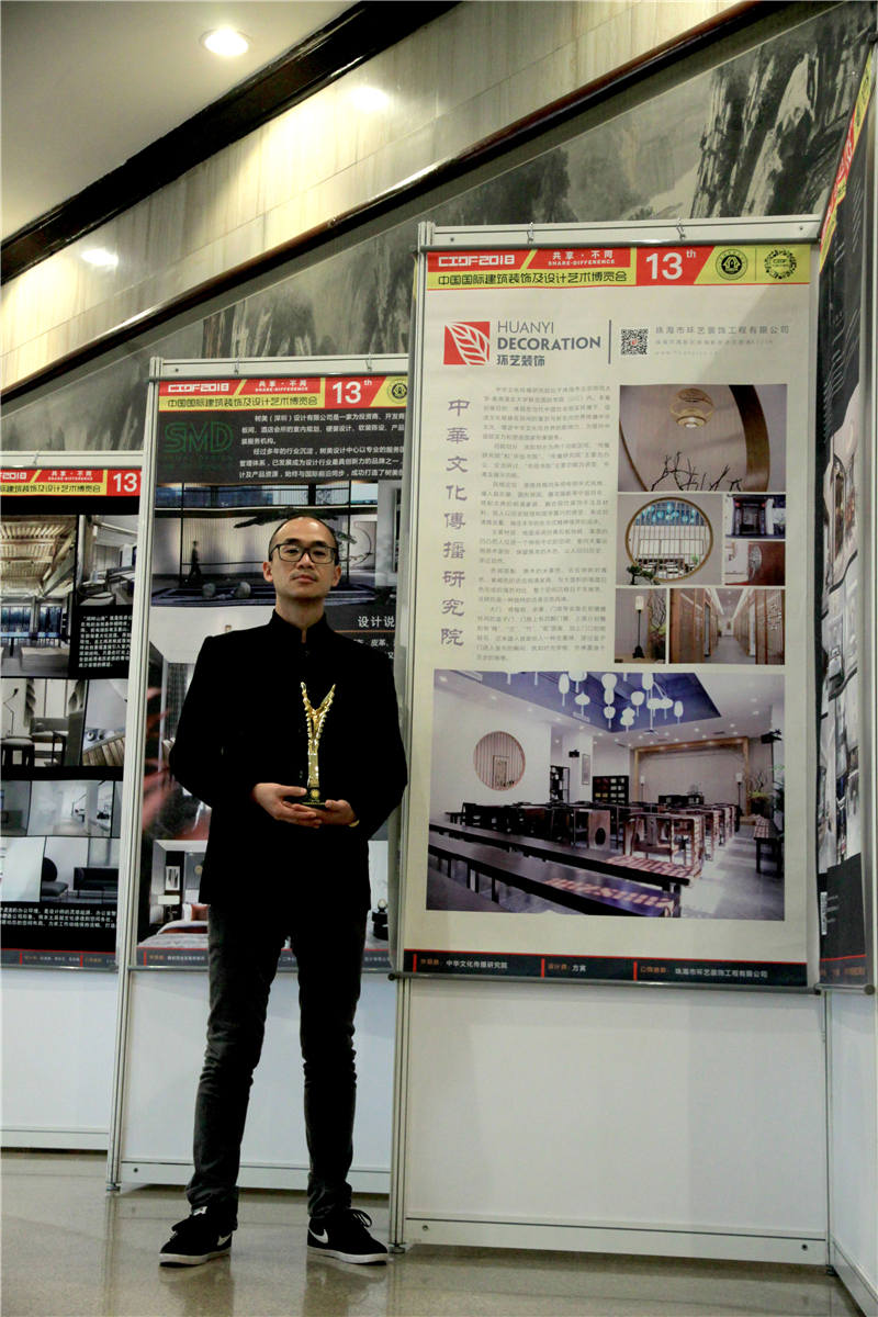 珠海環(huán)藝裝飾工程有公司選送作品《UIC中華文化傳播研究院》榮獲中國建筑裝飾協(xié)會主辦的第十三屆中國國際建筑裝飾設(shè)計藝術(shù)博覽會【華鼎獎】文體教育空間類金獎;設(shè)計師方寅榮獲2017-2018年度中國室內(nèi)設(shè)計杰出青年設(shè)計師。